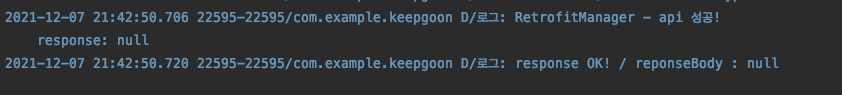 API๊ฐ ์ ๋๋ก ์ฐ๋ฆฌ๊ธด ํ์ง๋ง, ๋ฐ์ response๋ฅผ ๋ก๊ทธ์ ์ฐ์ด๋ณด๋ฉด null ์ด ๋์จ๋ค.