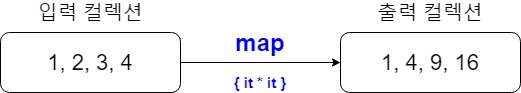 >>> println(list.map { it * it }) //์ ๊ณฑ ๋ง๋ค๊ธฐ (1x1, 2x2, 3x3, 4x4)
