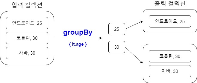 groupBy : ๋ฆฌ์คํธ๋ฅผ ์ฌ๋ฌ ๊ทธ๋ฃน์ผ๋ก ์ด๋ฃจ์ด์ง ๋งต์ผ๋ก ๋ณ๊ฒฝ
