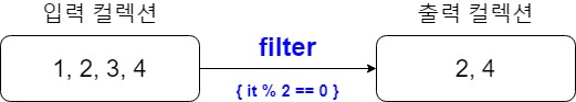 >>> println(list.filter { it % 2 == 0 }) //์ง์๋ง ํํฐ๋ง