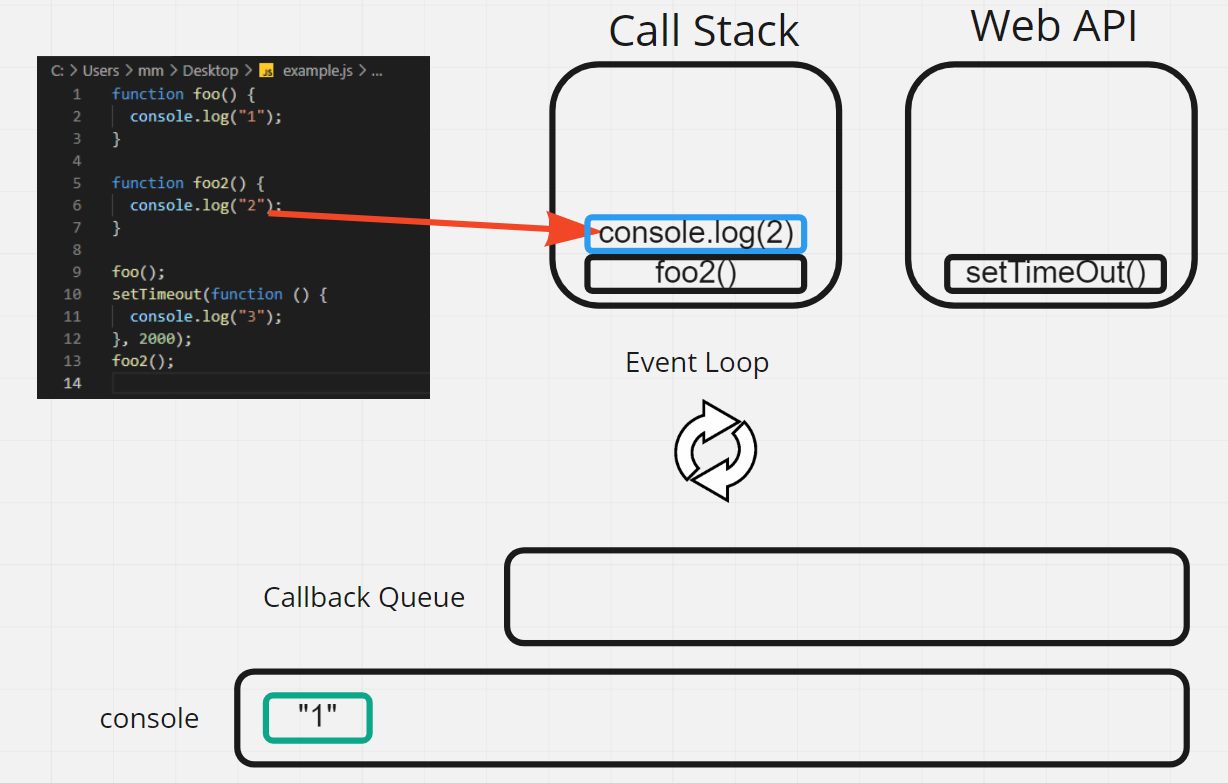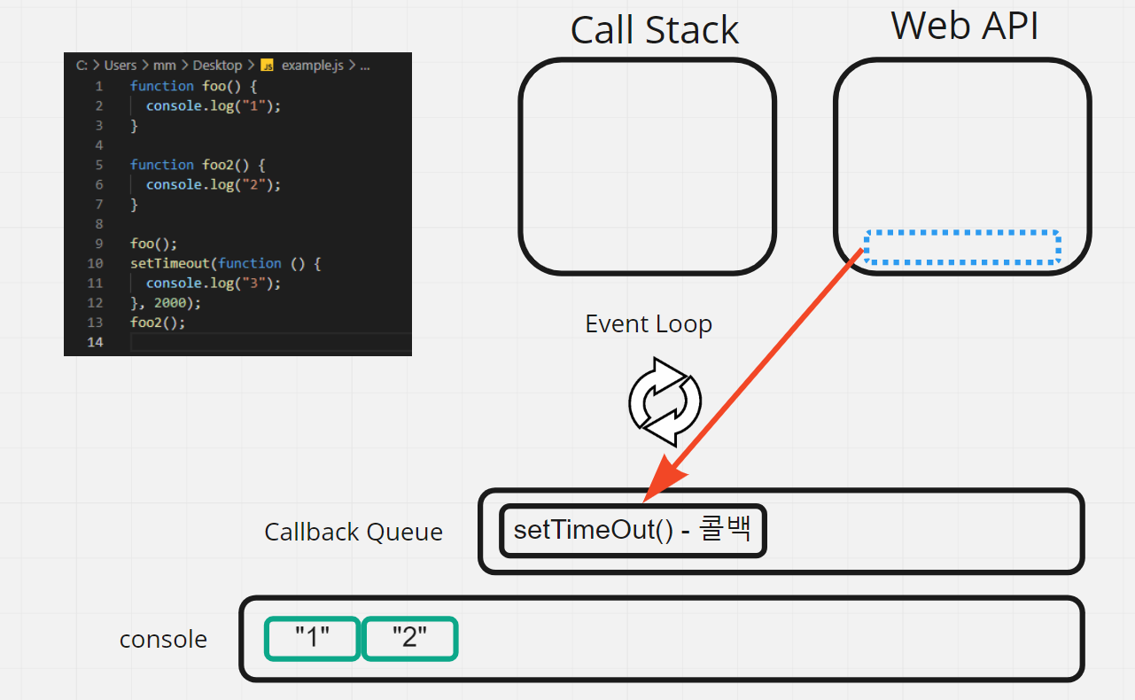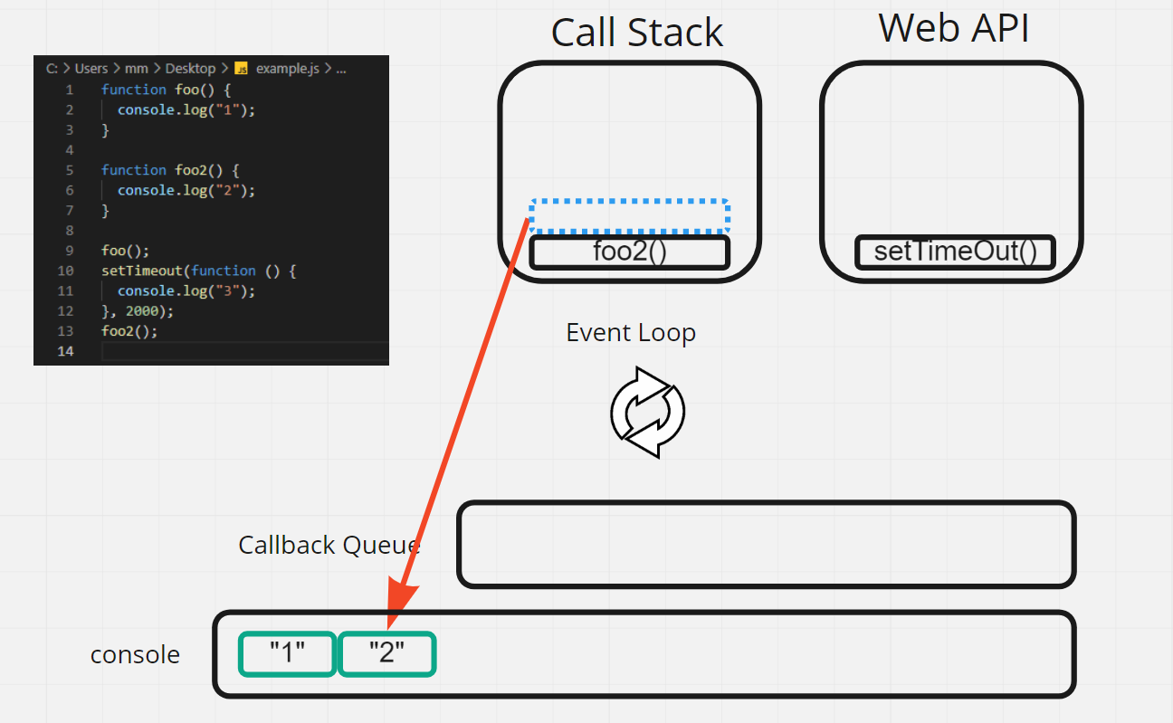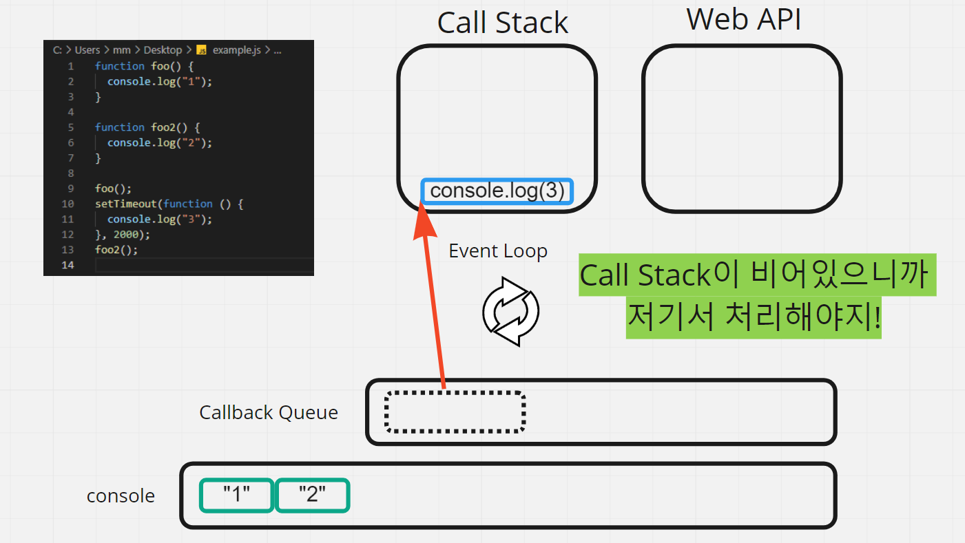 ์ฌ๊ธฐ์ ํท๊ฐ๋ฆฌ์๋ฉด ์ ๋๋ ๊ฒ Call Stack์ ์๋ foo2() ํจ์๊ฐ ์ข ๋ฃ๋๊ณ ๋์์ผ Web API๋ฅผ ์ฒ๋ฆฌํ๋ ๊ฒ ์๋๊ณ setTimeOut()์ด Web API๋ก ๋์ด๊ฐ ์์ ๋ถํฐ ์ฒ๋ฆฌ๋๊ณ ์๋ ๊ฒ์ ๋๋ค. ์ฆ, Call Stack์์๋ foo2() ํจ์๋ฅผ ์ฒ๋ฆฌํ๊ณ ์์๊ณ , Web API์์๋ setTimeOut()์ 2์ด ๋์ ๋๋ฆฌ๊ณ ์์๋ค๋ ๊ฒ์ด์ฃ .