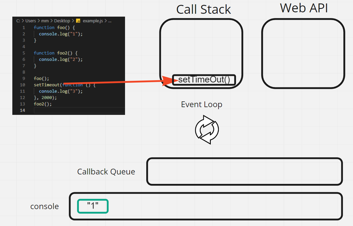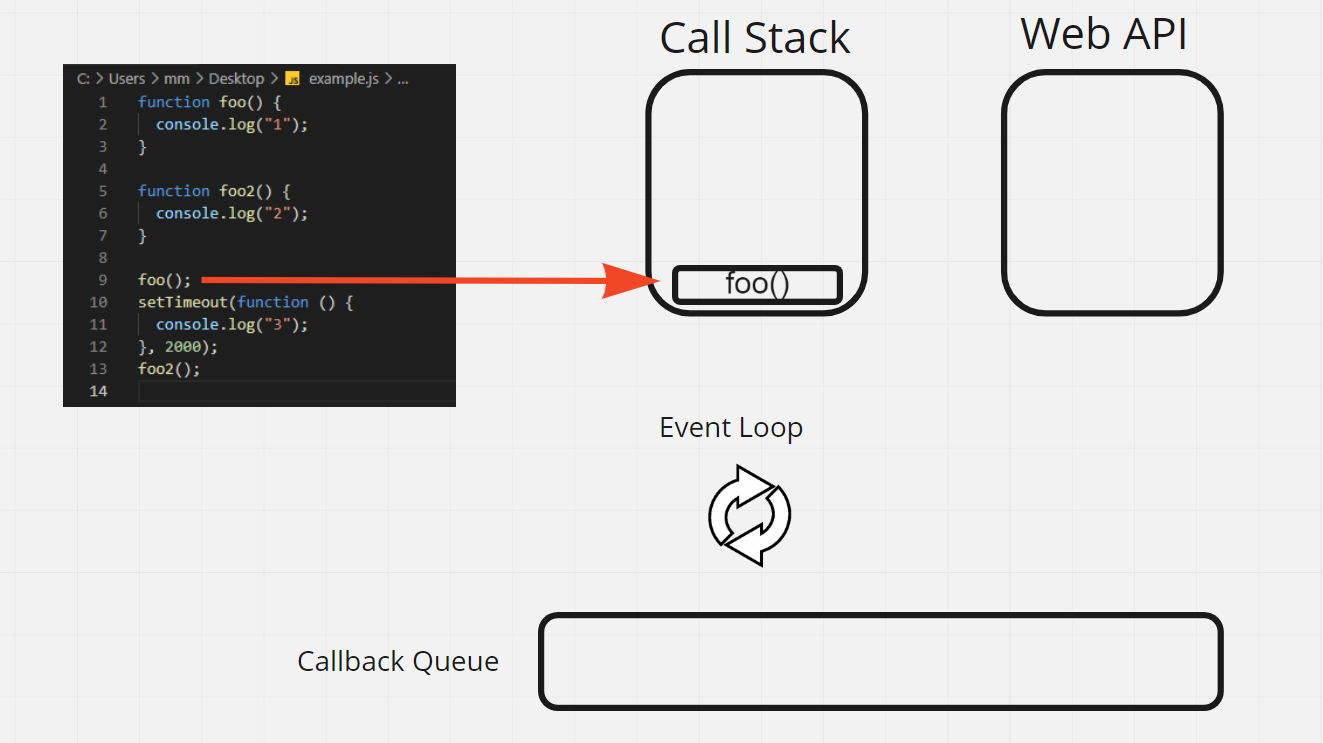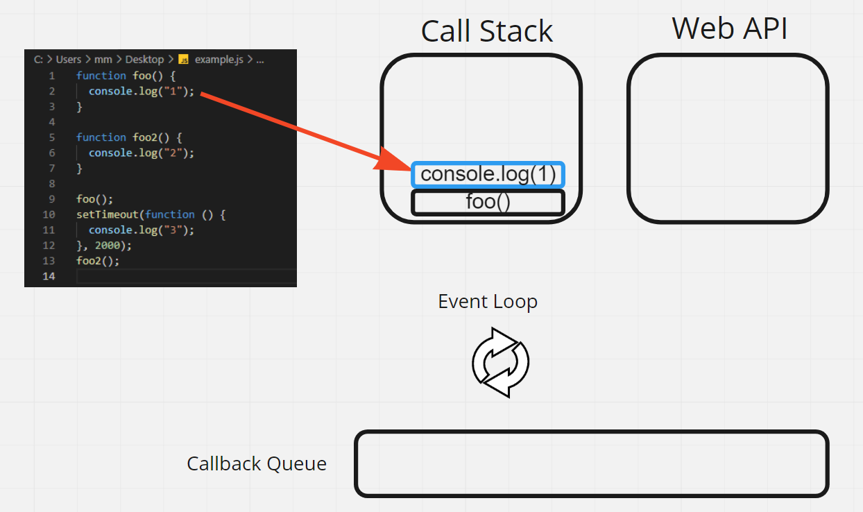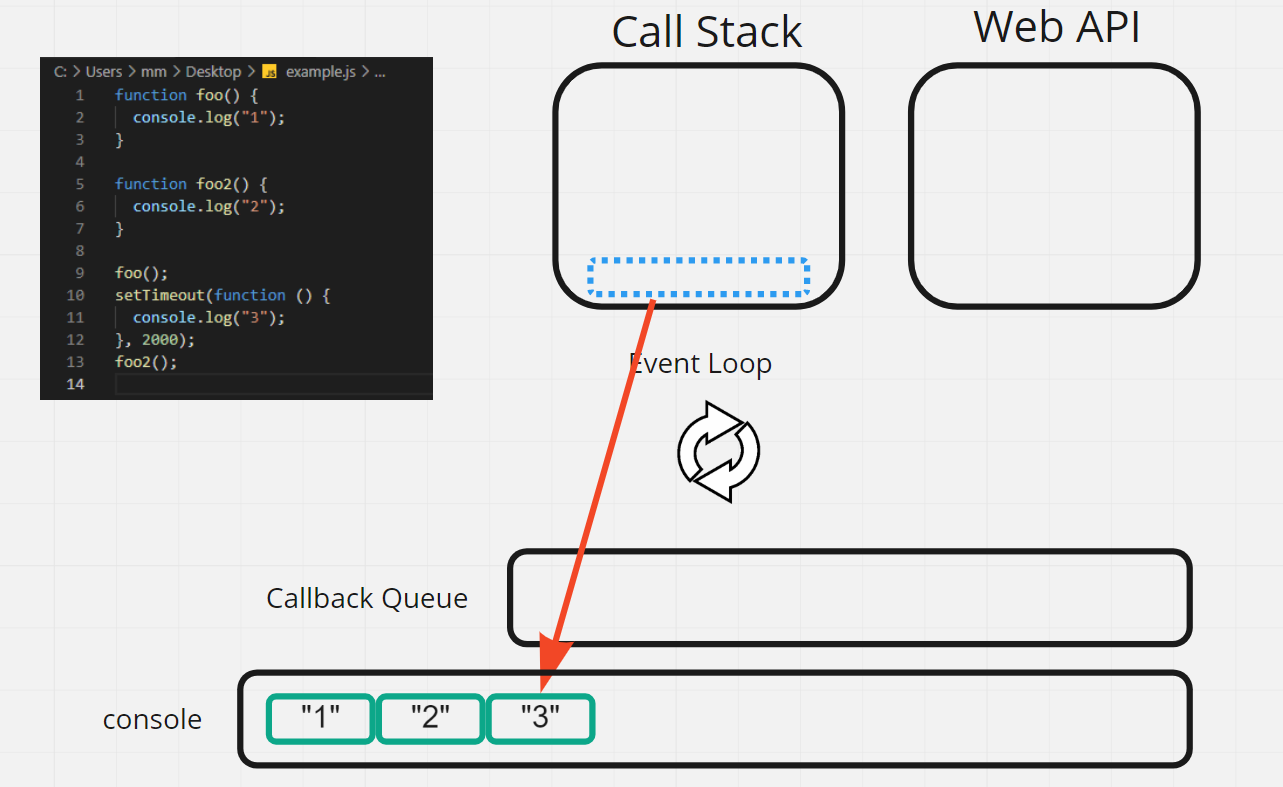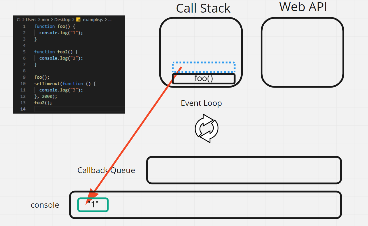 ์ฌ๊ธฐ์ ํท๊ฐ๋ฆฌ์๋ฉด ์ ๋๋ ๊ฒ Call Stack์ ์๋ foo2() ํจ์๊ฐ ์ข ๋ฃ๋๊ณ ๋์์ผ Web API๋ฅผ ์ฒ๋ฆฌํ๋ ๊ฒ ์๋๊ณ setTimeOut()์ด Web API๋ก ๋์ด๊ฐ ์์ ๋ถํฐ ์ฒ๋ฆฌ๋๊ณ ์๋ ๊ฒ์ ๋๋ค. ์ฆ, Call Stack์์๋ foo2() ํจ์๋ฅผ ์ฒ๋ฆฌํ๊ณ ์์๊ณ , Web API์์๋ setTimeOut()์ 2์ด ๋์ ๋๋ฆฌ๊ณ ์์๋ค๋ ๊ฒ์ด์ฃ .
