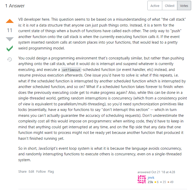 ์ฌ๊ธฐ์ ๋๋ ๊ถ๊ธ์ฆ! ๊ทธ๋ ๋ค๋ฉด ์ Event Loop๋ Call Stack์ด ๋น์ด์ ธ์๋์ง ํ์ธํ๊ณ Callback Queue์ ํจ์๋ฅผ ์ฒ๋ฆฌํ๋ ๊ฒ์ผ๊น์? Call Stack์ด ๋น์ด์ ธ ์๋ ๋ง๋ ์๊ด์์ด ๊ทธ๋ฅ ๋ฃ์ด๋ฒ๋ฆฌ๋ฉด ํจ์ฌ ๋ ํ๋ก๊ทธ๋จ์ด ๋นจ๋ผ์ง๊ณ ์ข์ ํ ๋ฐ ๋ง์ด์ฃ . ์ ๋ ์ด๋ฐ ๊ถ๊ธ์ฆ์ด ์์ด์ Stack Overflow ์ฌ์ดํธ๋ฅผ ๋ค์ ธ๋ณด๊ฒ ๋์๊ณ , ๋ง์นจ V8 ์์ง์ ๊ฐ๋ฐํ์ จ๋ ๋ถ์ด ๋ต๋ณ์ ์จ์ฃผ์ ๊ธ์ ์ฐพ์ ์ ์์์ต๋๋ค.