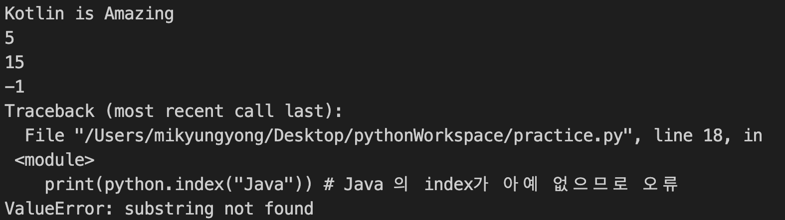 #print(python.index("Java")) # Java ์ index๊ฐ ์์ ์์ผ๋ฏ๋ก ์ค๋ฅ