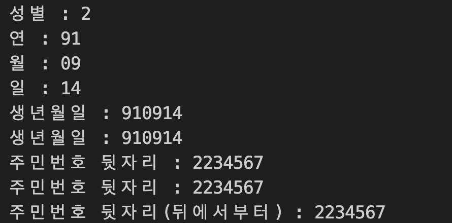 print("์ฃผ๋ฏผ๋ฒํธ ๋ท์๋ฆฌ : " + jumin[7:14])