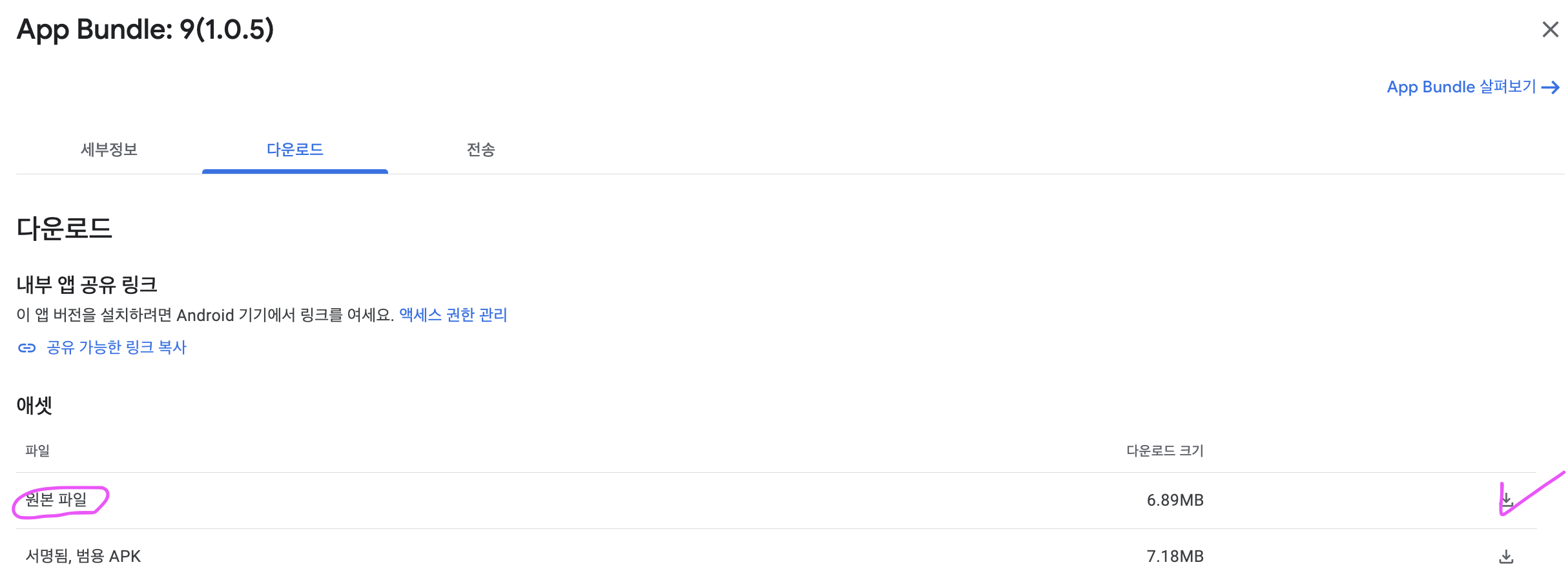 - Google Play Console → ํ๋ก๋์ → ์ถ์ → ์ถ์ ์ธ๋ถ์ ๋ณด ๋ณด๊ธฐ → App Bundle
