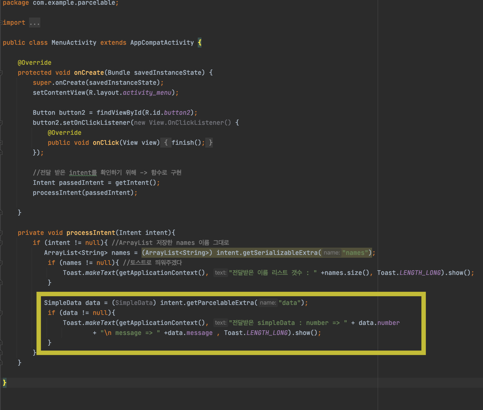 4. MainActivity์์ Intent ์ ์ ์ฅํ parcel์ ๋ถ๋ฌ์์ Toast๋ก ๋์ธ ์ ์๋ค!