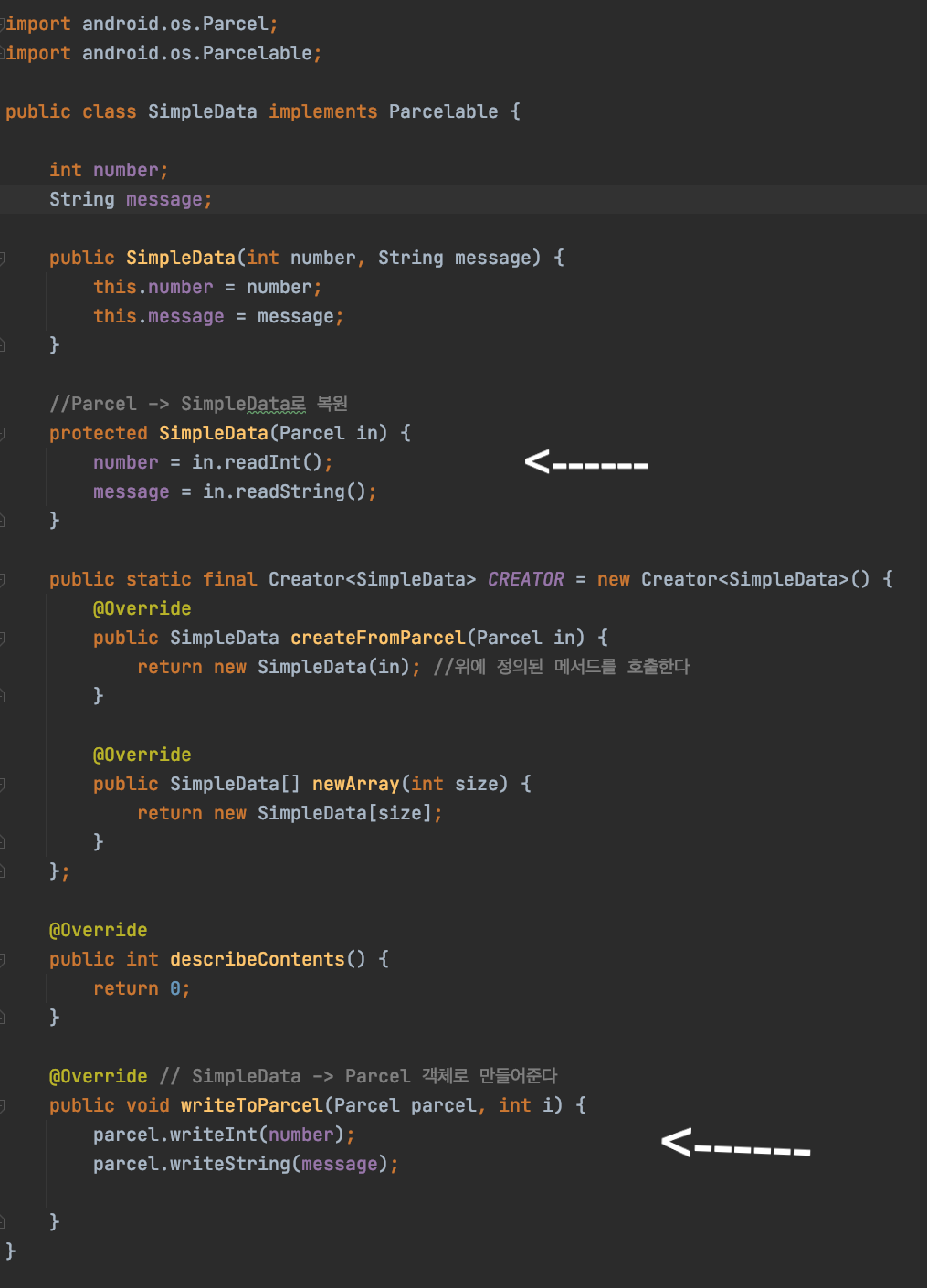 MK_____ 2021. 10. 7. 17:581. ์ธํฐํ์ด์ค Parcelable์ ๊ตฌํํ๋SimpleData.java ํด๋์ค๋ฅผ ์์ฑํ๋ค.