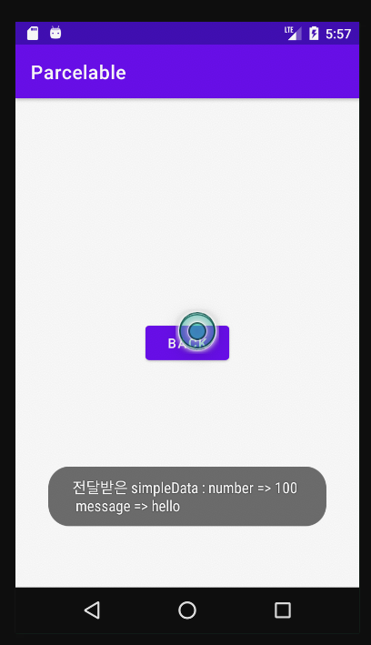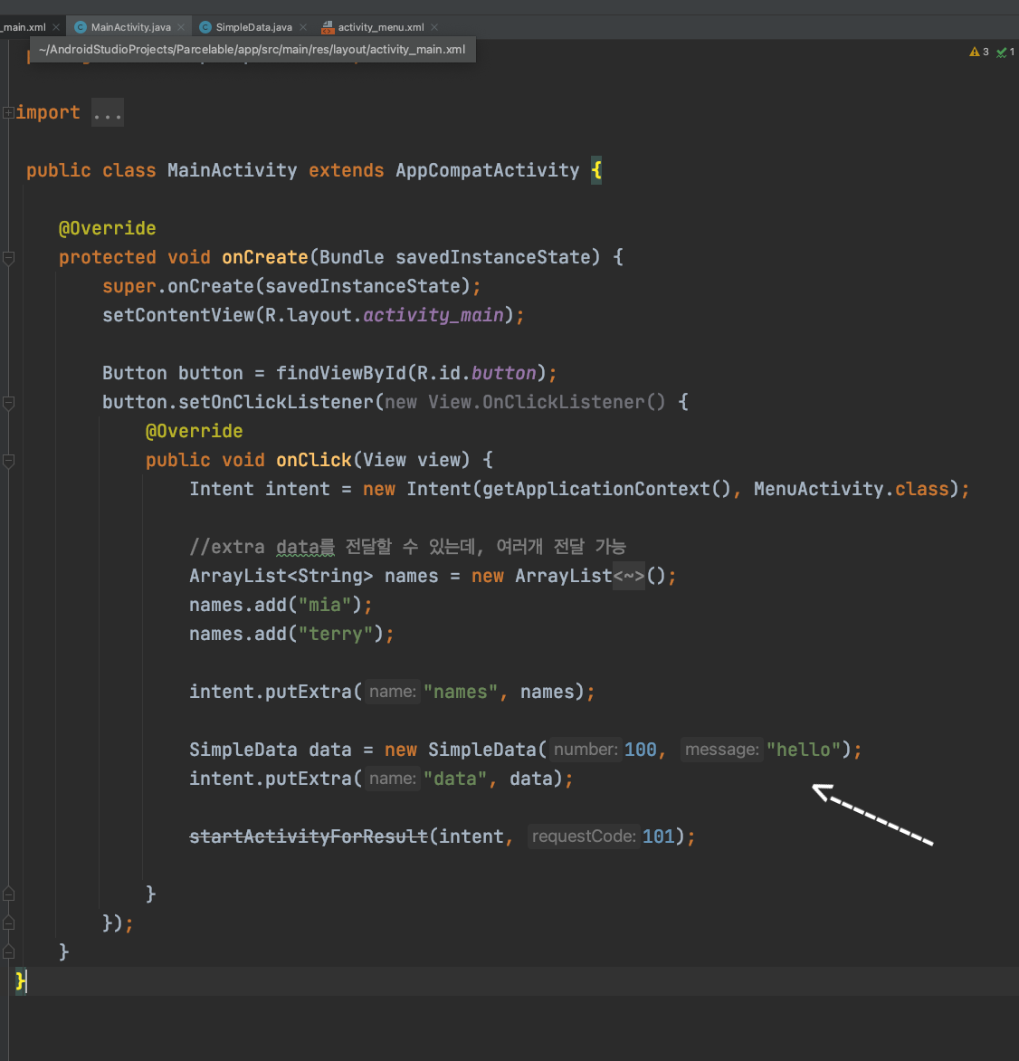 MainActivity์์ Parcelable์ ๊ตฌํํ ํด๋์ค๋ฅผ ์ด์ฉํ์ฌ(SimpleData.java) intent์ ์ ์ฅํ ์ ์๊ฒ ๋์๋ค!~