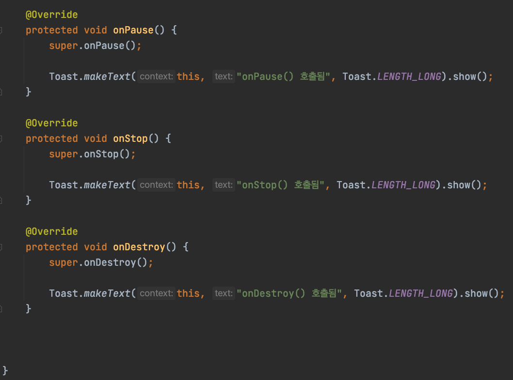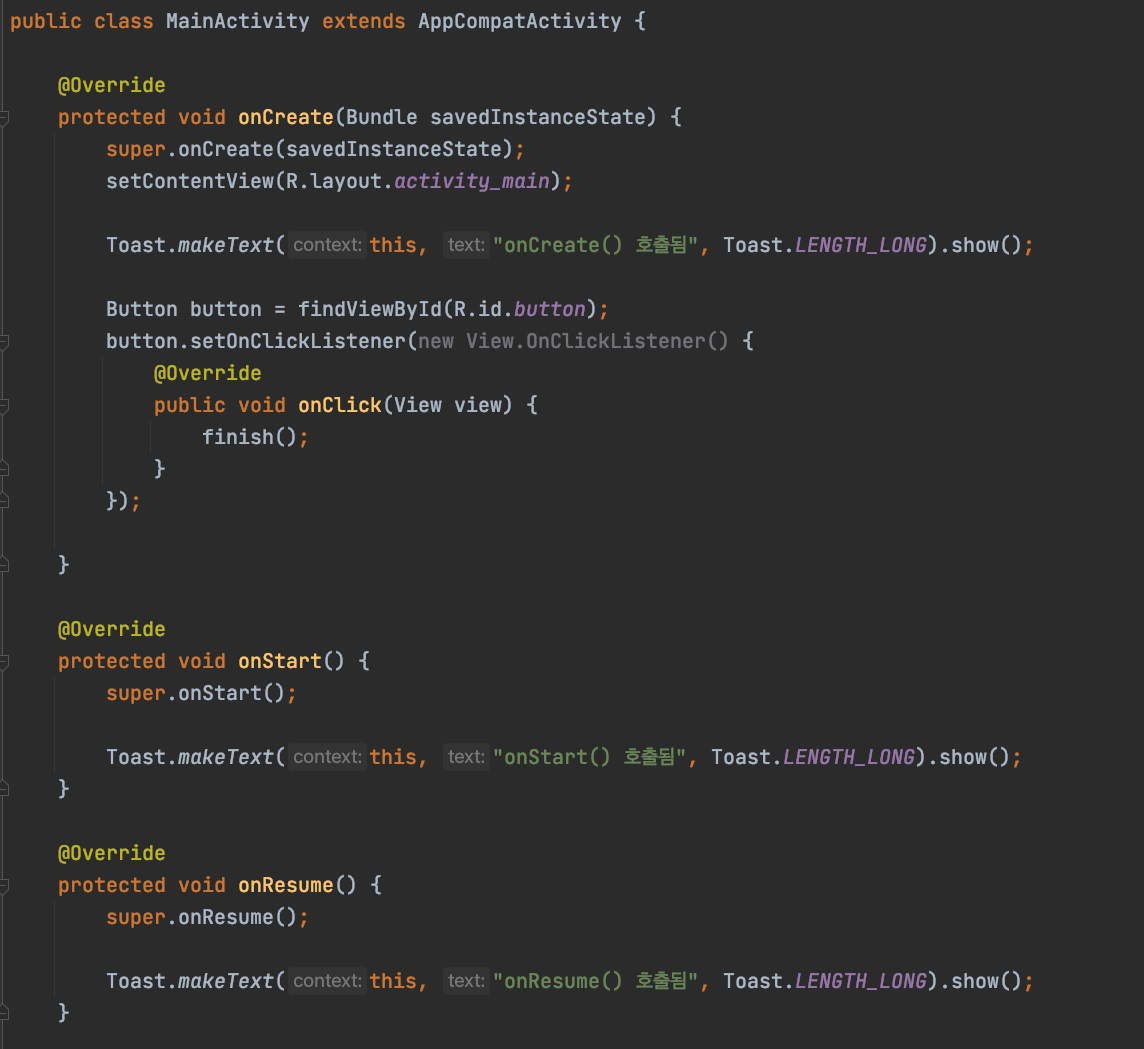ํ๋ฉด ๋ ์ง๊ธฐ ์ง์ ๊น์ง onCreate() -> onStart() -> onResume() ์คํ!
