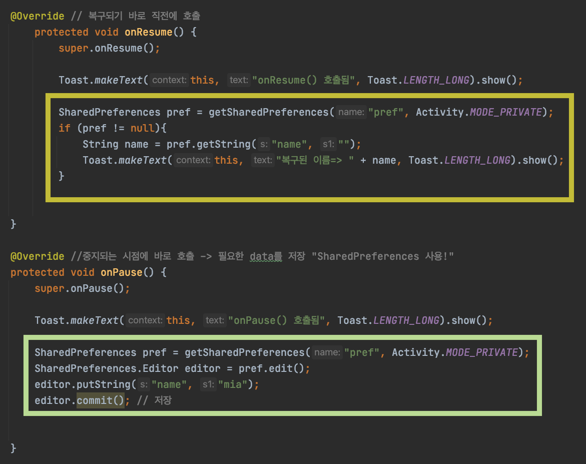 [Android Studio] ์๋๋ก์ด๋ ์๋ช ์ฃผ๊ธฐ (life cycle) + SharedPreferences ์ฌ์ฉํ์ฌ ํ๋ฉด ๋๋๊ธฐ ์ ์ data ์ ์ฅ ๋ณธ๋ฌธ