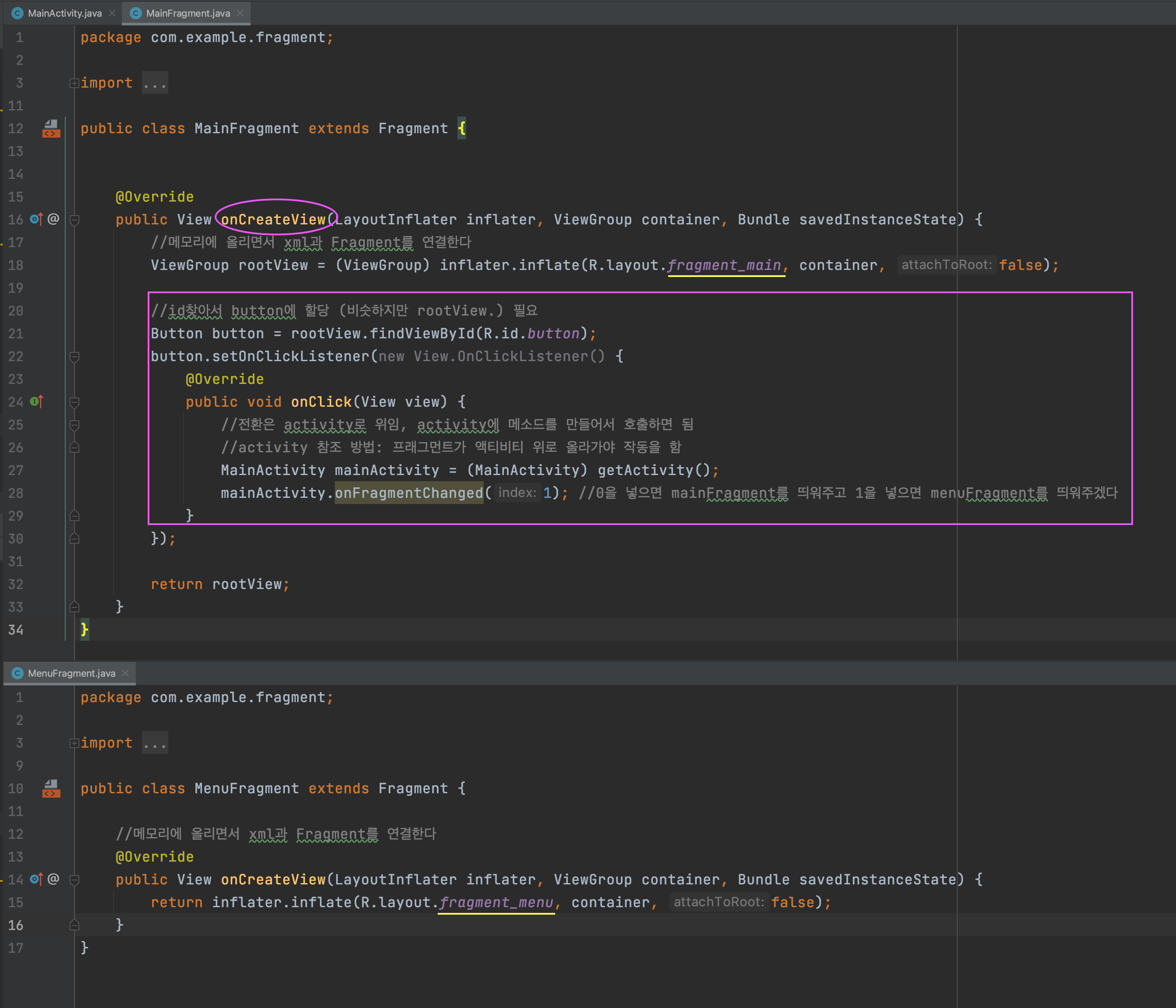 ๊ทธ๋ฆฌ๊ณ xml๊ณผ Fragment๋ฅผ ๋ฉ๋ชจ๋ฆฌ ์ฌ๋ฆฌ๋ฉด์ ์ฐ๊ฒฐ ~ ๊ทธ๋์ fragment_main / fragment_menu ๋ผ๊ณ ์จ์ค