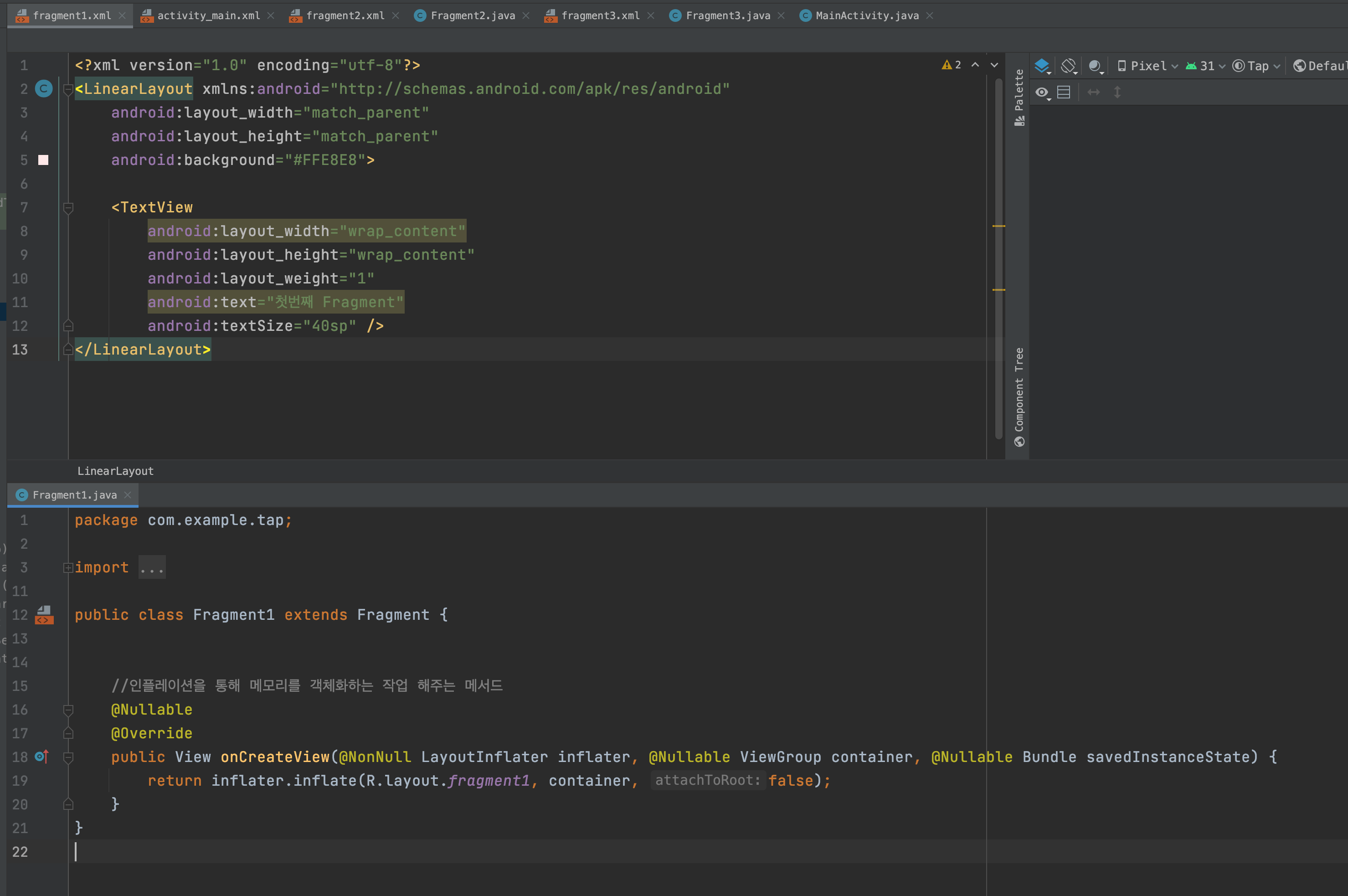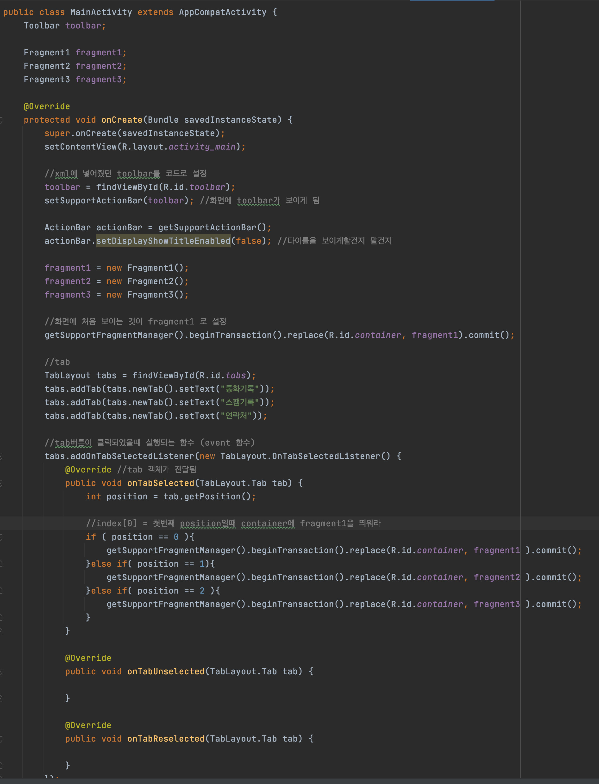 각 탭마다 Fragment 1,2,3 존재