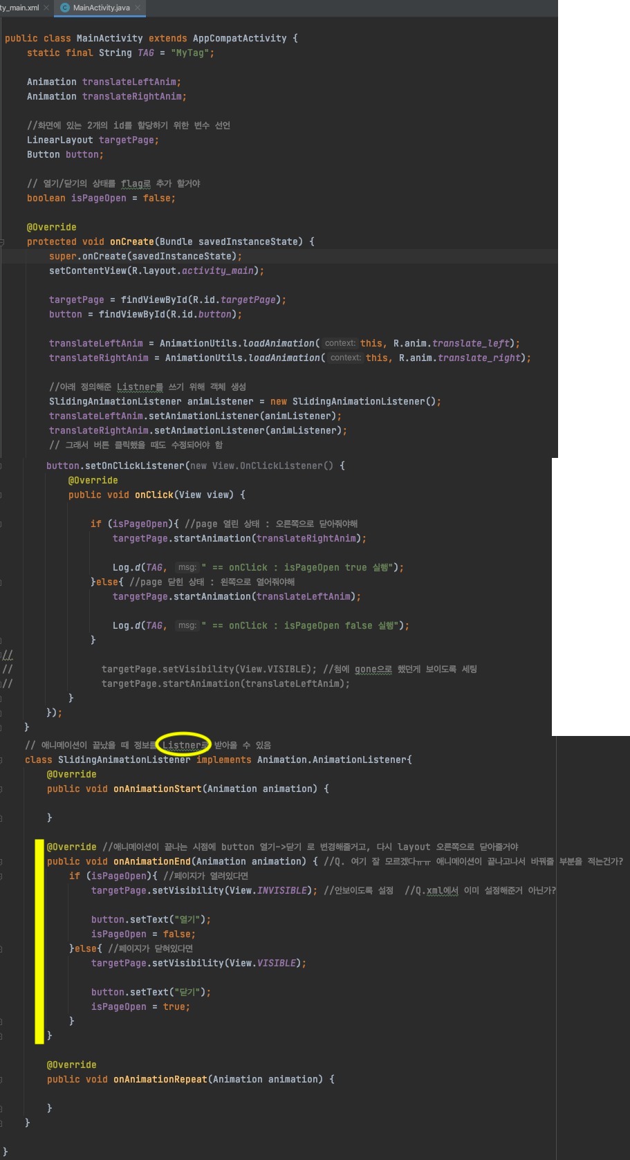 2. 만들어준 애니메이션 xml 2개를 로드해서 Animation 객체에 담아준다