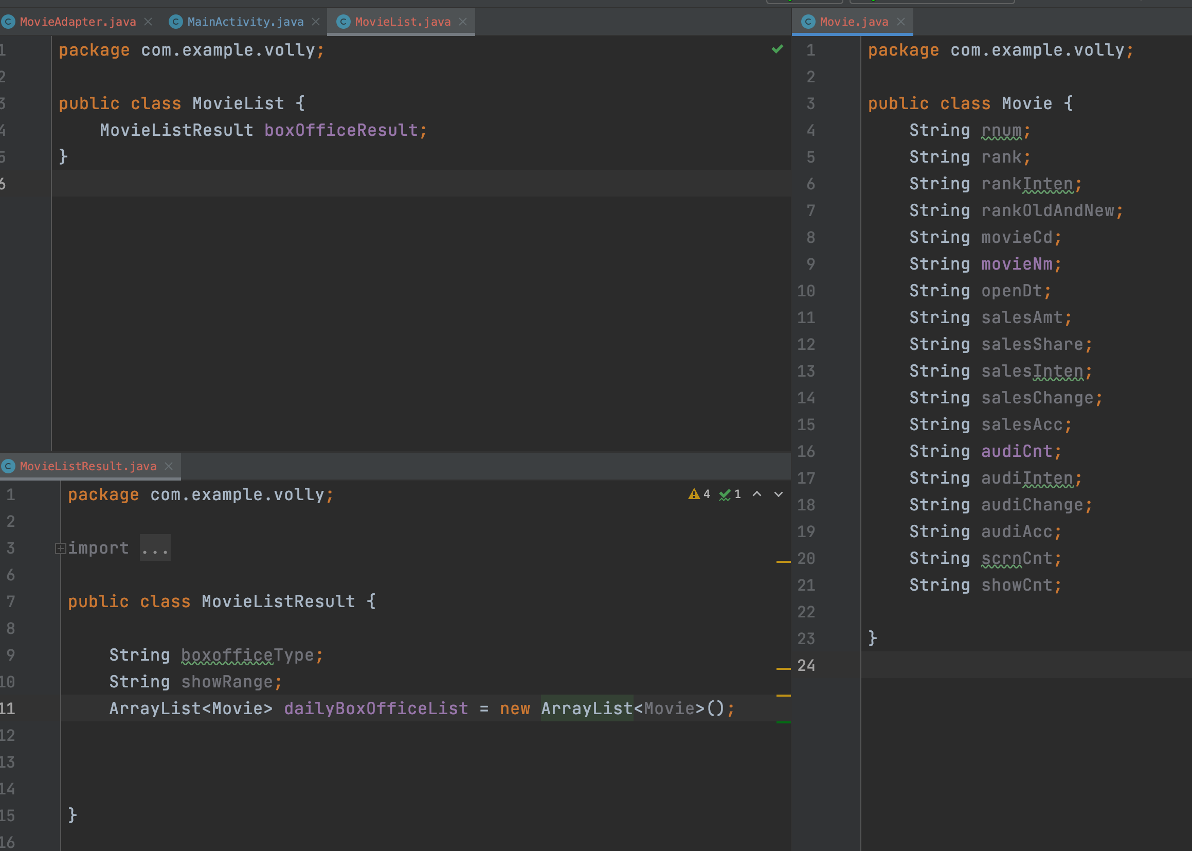 //์ด JSON ์๋ต๊ฐ์ ๋ฃ์ด์ค class๋ฅผ ์ ์ํด์คฌ๊ณ (Movie, MovieList, MovieListResult)